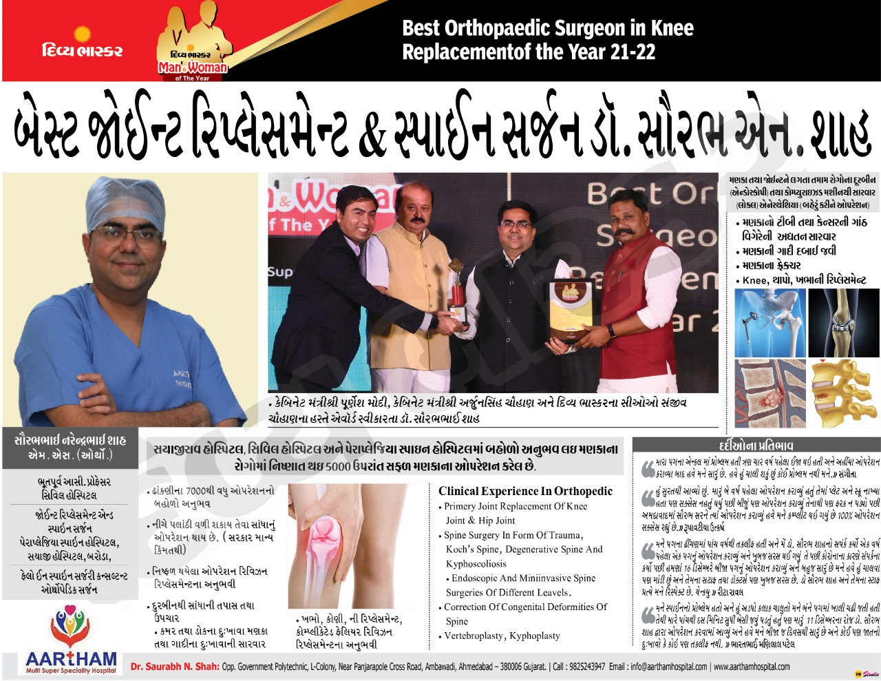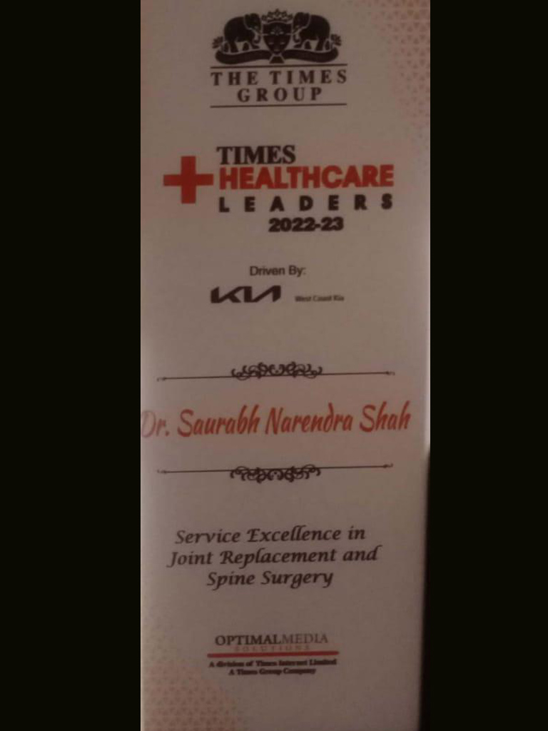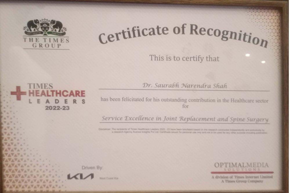 Dr. Saurabh N. Shah received award for best joint replacement surgeon in Year 2021-2022